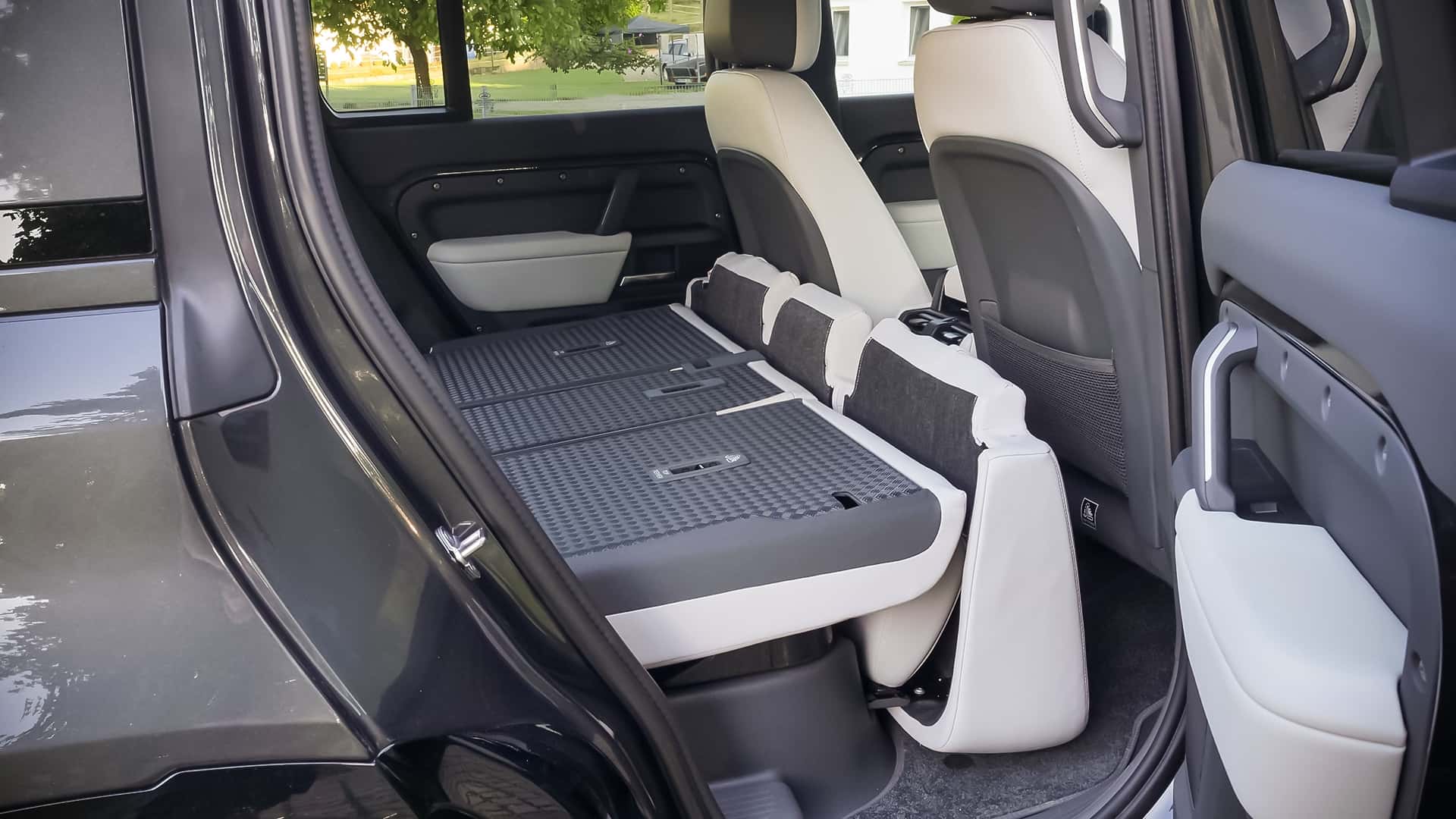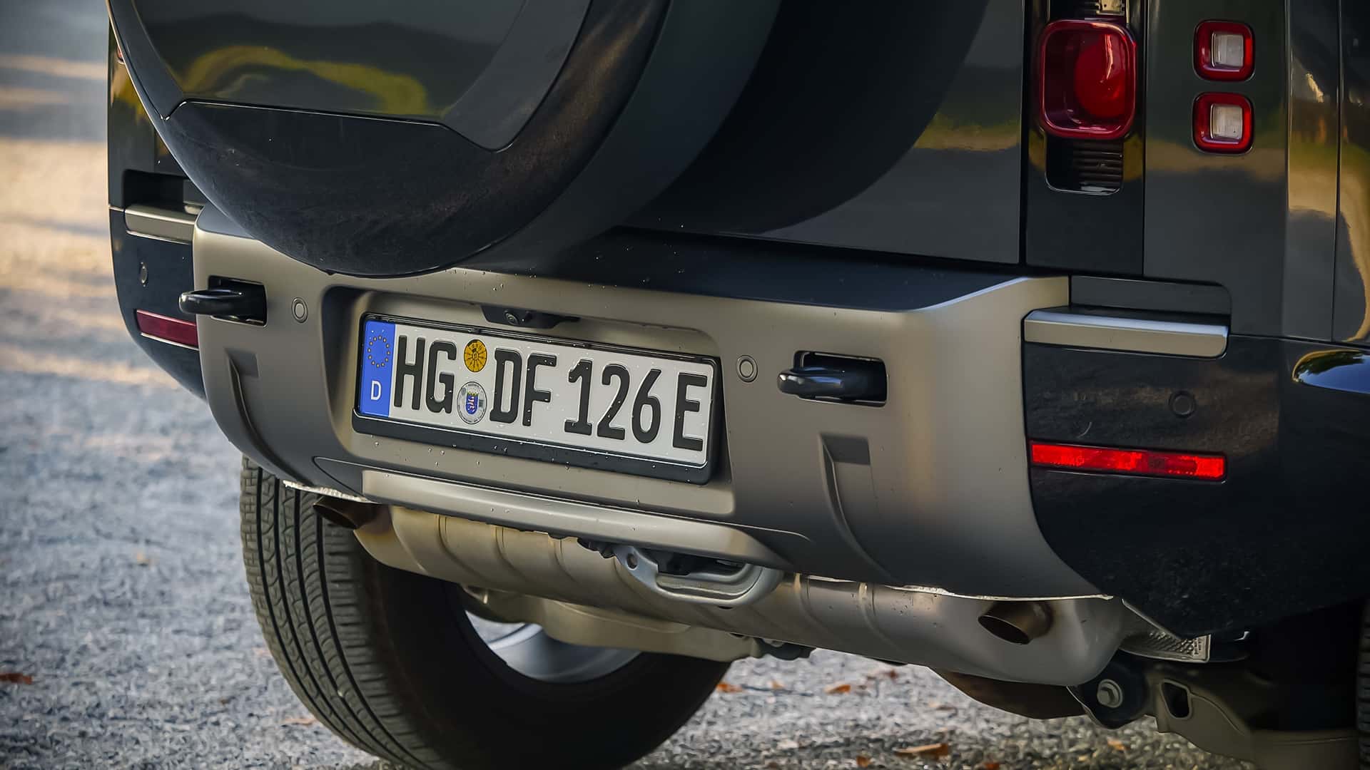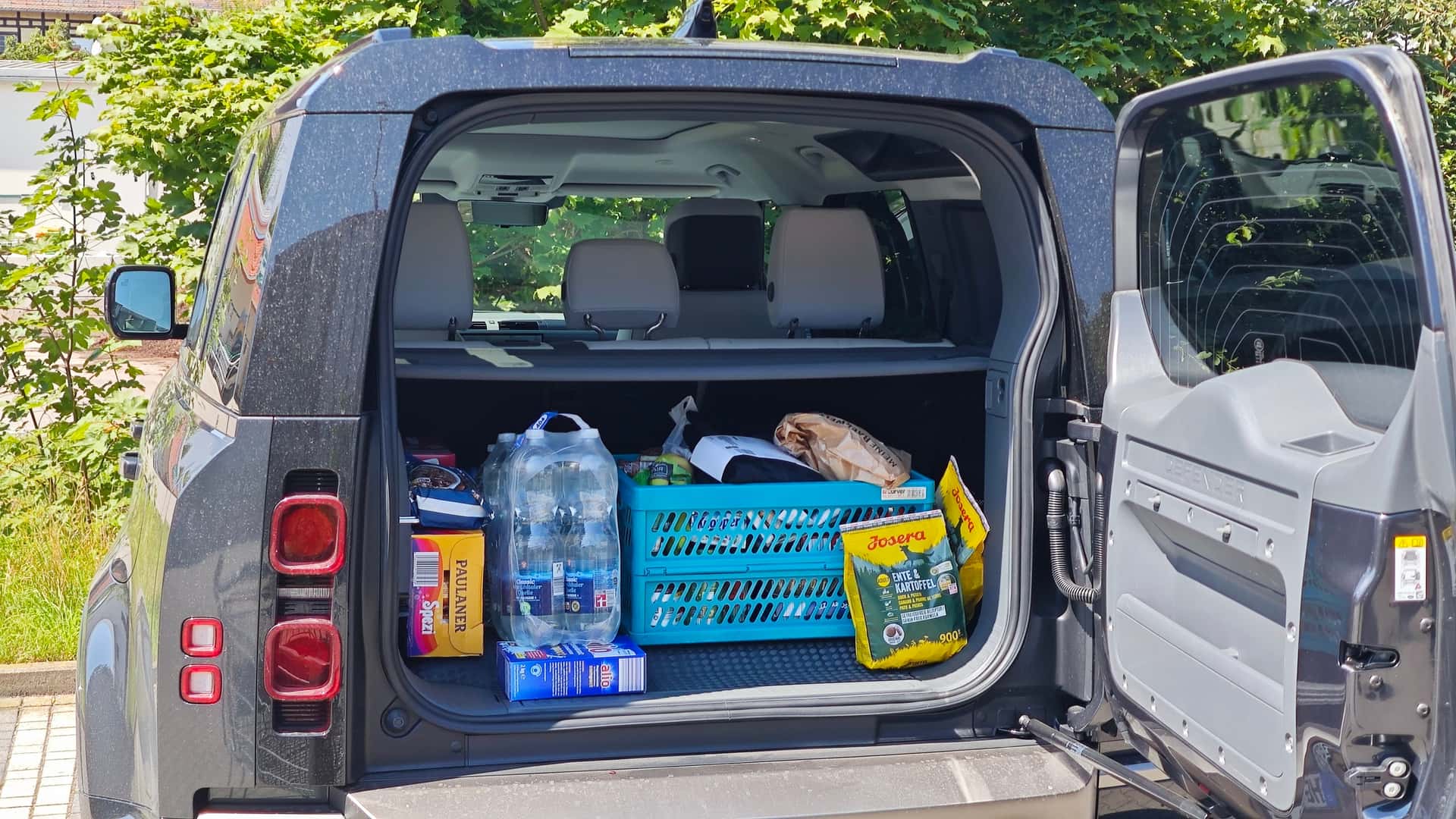 So groß der Defender außen wirkt, so eingeschränkt zeigt er sich beim Gepäckraum. 696 Liter sind es bei aufgestellten Rücksitzen – deutlich weniger als bei den reinen Verbrennern. Grund ist die Batterie, die Höhe und Tiefe des Kofferraums spürbar reduziert. Dazu kommt das außen montierte Ersatzrad, das den Zugang erschwert.