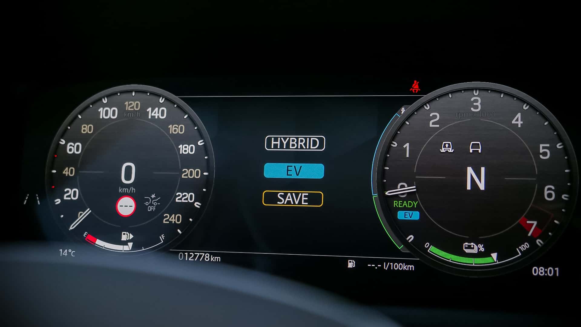 Unter der Haube arbeitet ein 2,0-Liter-Vierzylinder-Turbobenziner mit 225 PS, flankiert von einem 143-PS-Elektromotor. Gemeinsam ergibt das 300 PS Systemleistung und 625 Newtonmeter Drehmoment – genug, um die 2,6 Tonnen Leergewicht souverän in Bewegung zu setzen. Der Sprint auf 100 km/h dauert 7,6 Sekunden, Überholmanöver gelingen dank E-Motor-Biss spontan und kräftig.