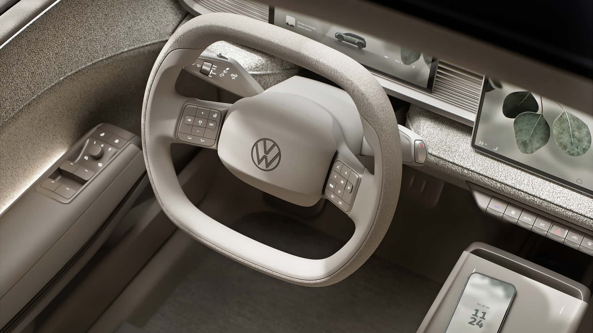 Ungewöhnlich: In den Sitzen sind mit Textil bezogene Knöpfe integriert, während in der Fahrertür die bekannten Fenster- und Spiegel-Bedienungen sitzen. Die Mittelkonsole hat offenbar einen Drehregler vor einer großen Wireless-Charging-Fläche für zwei Smartphones. Darunter: Cupholder – und echte Eukalyptusblätter hinter halbtransparenten Panels.