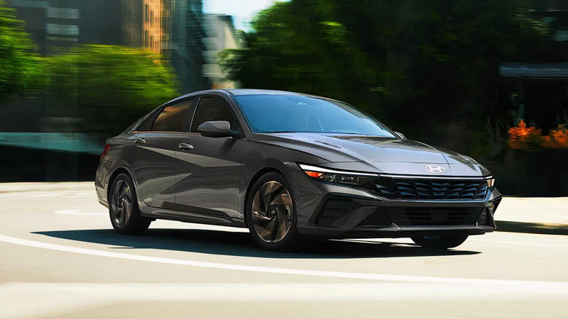 Side profile shot of a 2024 Hyundai Elantra Hybrid driving down the road