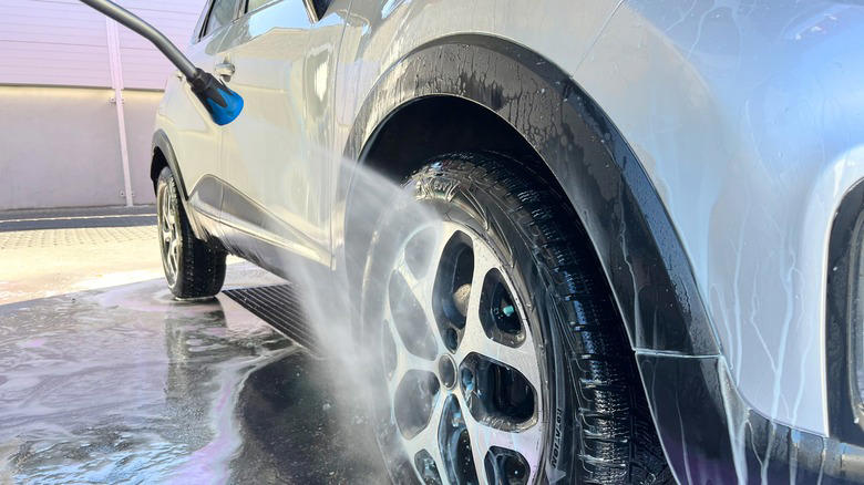 To do it right, use a garden hose with a high-pressure nozzle or, if you're serious about car care, a pressure washer set to a relatively safe level. Starting high and working down, the water will help the dirt and debris flow from already clean areas onto the ground and away from the vehicle. Make a note to also give special attention to wheel wells, the undercarriage, and areas around the tires, as they're dirt magnets. Each collects grime easily, which can accidentally get spread during a wash if you miss them.