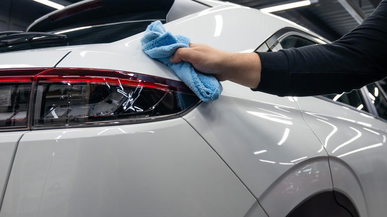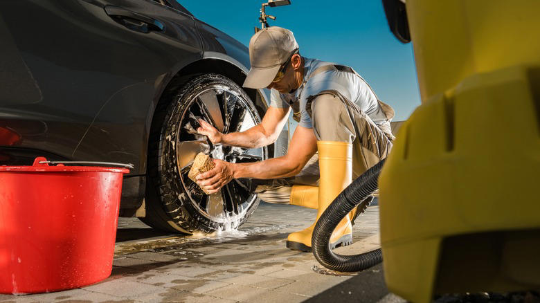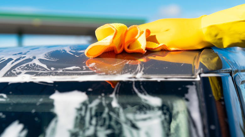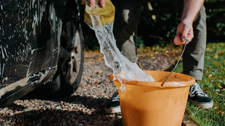 When shopping for soap at your nearest automotive retailer, look for labels that either have "pH-balanced" directly on them or "safe for all finishes." Neglecting to find a pH-balanced soap and opting for something like Dawn dish soap or a similar household product as a cleaning hack could be detrimental to your car's exterior. While dish soaps are known for cutting through grease in the kitchen, they could be a disaster on the vehicle as they're too harsh and can strip away protective wax or dull the paint. Instead, make this small change in your car care routine and preserve its value. Not to mention, the pH-balance soap will really make your car showroom shiny when paired with a nice microfiber cloth wipe down.
