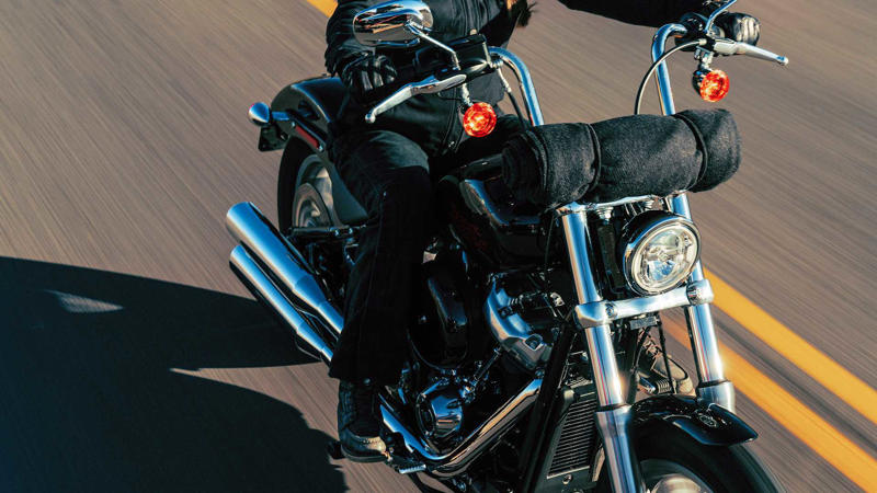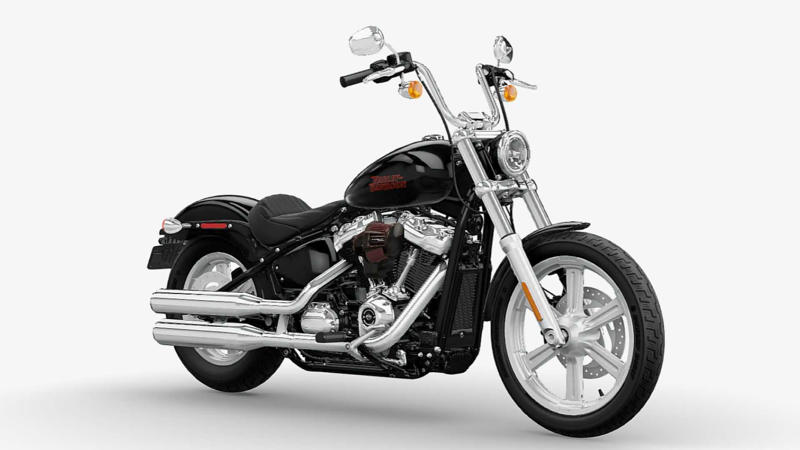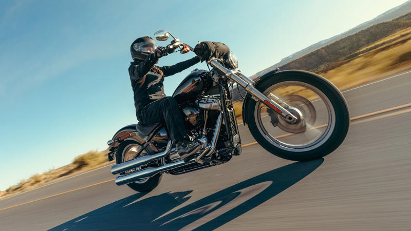 Black 2023 Harley-Davidson Softail Standard cruising on the road