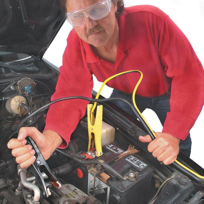 Clean corrosion from the top of the auto battery first and then clean corrosion from around the battery cables with a post cleaner.