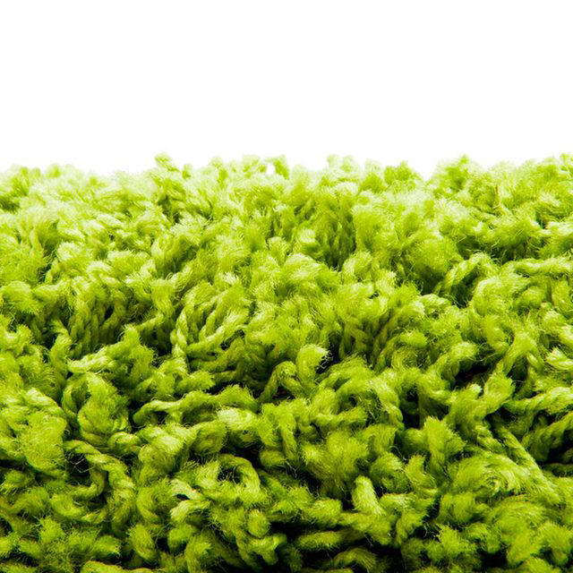 A vibrant green textured surface resembles shag carpet, with soft, tangled fibers peeking through, creating a lively and inviting appearance against a white background.
