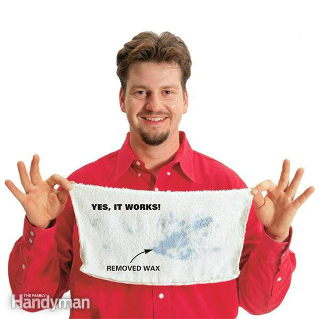 A man in a red shirt holds up a white towel, displaying a stain and text proclaiming its effectiveness in removing wax.