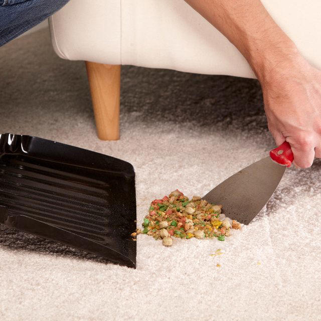 Using a paper towel or rag to scoop up solids can also force the stain deeper into the carpet. Your best bet is to use a putty knife and dustpan to scrape it up. Sink the edge of the putty knife into the carpet at the edge of the mess, then push it forward to move the solid waste up and into the dustpan.