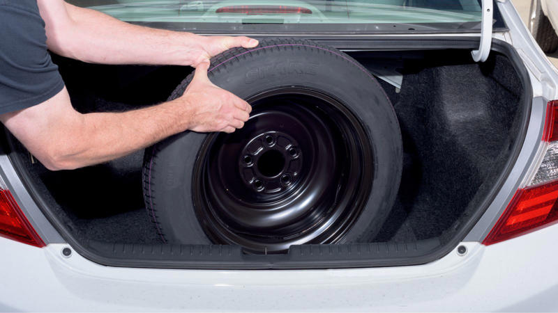 Top of the list is the spare tire. Most cars come with a spare but double-check that it’s still there and usable. The tire on the spare must be properly inflated and in good condition, stored securely in the trunk. A donut spare will do for short distances, but a full-sized spare is better.