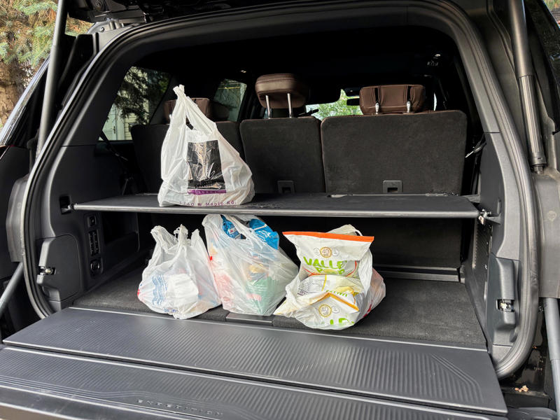 The 2025 Ford Expedition's cargo area features a multipurpose shelf and two-peice power tailgate.