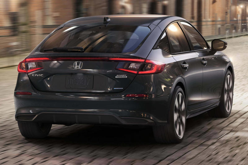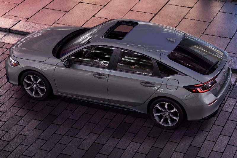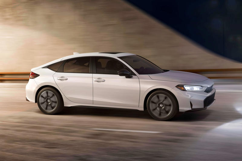 The 2025 Honda Civic starts at $25,400 for the LX sedan; the top of the lineup is the Sport Touring Hybrid Hatchback (seen here), powered by Honda’s twin electric motor, 2.0-liter ICE hybrid system.