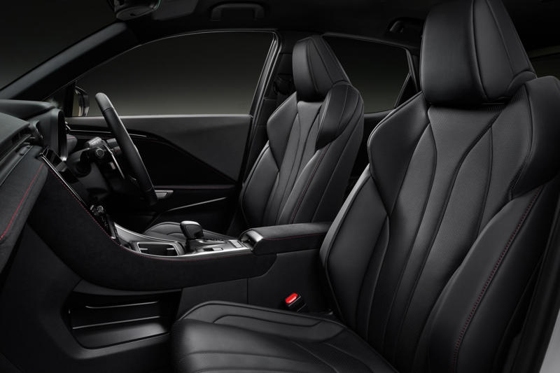 Inside there are black leather-accented sports front seats, as well as a leather-accented shift knob, dimpled steering wheel with contrast red stitching, and suede trim throughout the cabin.