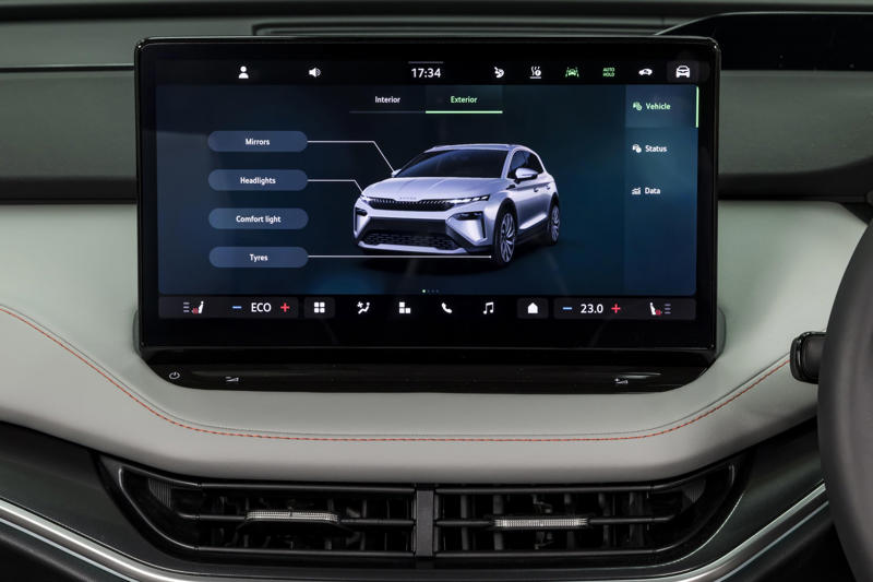 You’ll notice a different colour scheme in this high-spec prototype as well as the ‘SKODA’ script on the steering wheel. The former is Elroq specific and is known as the ‘Lodge’ interior globally – it should form the basis of the 130 Edition.