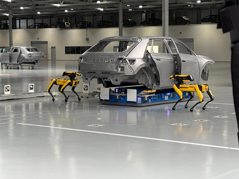 The Metaplant’s workforce includes two eerie but likable dog-like Boston Dynamics robots — both called “Spot" — that inspect vehicle bodies with bright, digital eyes.