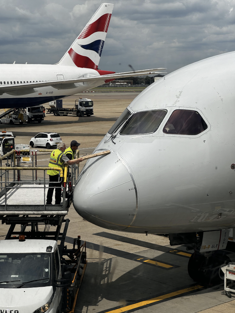 AA ground crew smoothing out the speed tape with a 2 by 4.