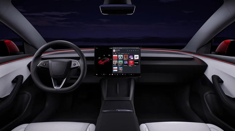 A Tesla Model 3 Interior Shot Of The Dashboard Showing A Massive Media Screen And Only A Few Buttons On The Steering Wheel