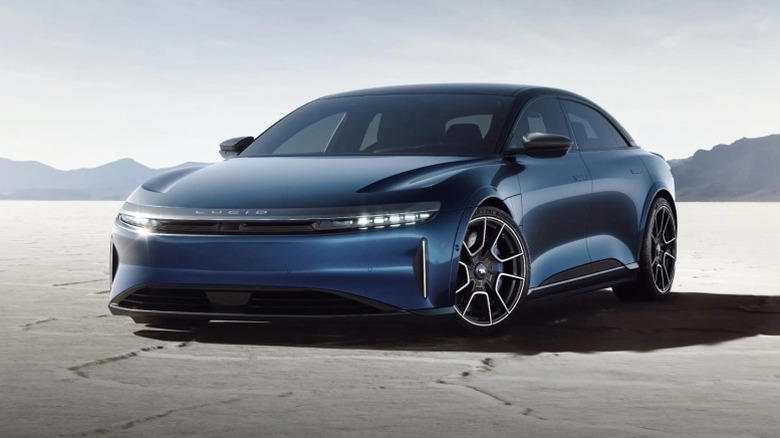 Lucid Air Sapphire parked on salt flats with mountains in the background