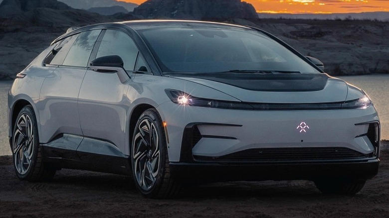 white Faraday Future FF 91 2.0 Futurist Alliance parked near a water body with mountains in the background