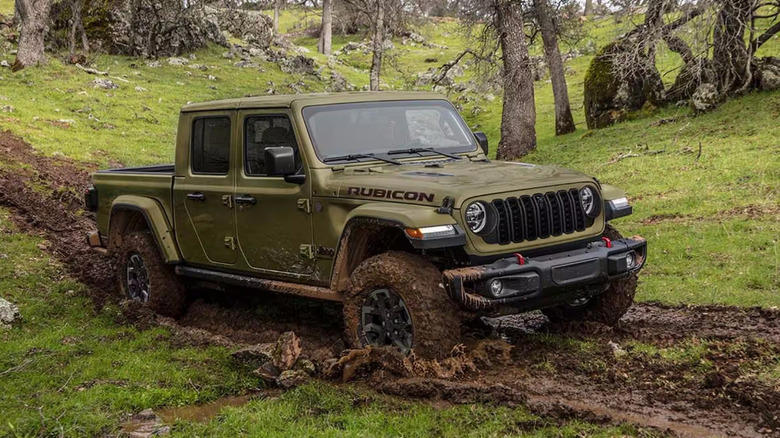 Army green Jeep Gladiator on muddy trail