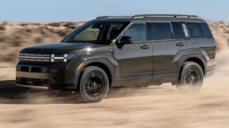 Hyundai Santa Fe driving off-road with with a clear sky in the background