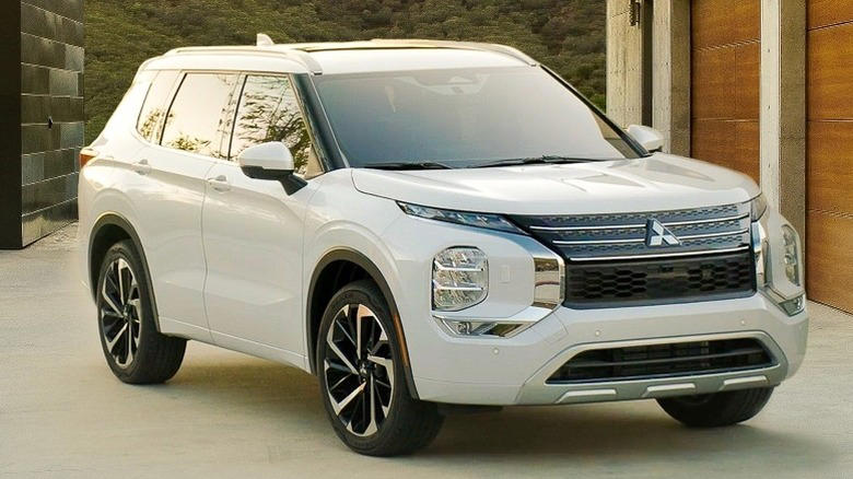 2022-24 Mitsubishi Outlander parked on a paved driveway in front of a house with trees and hills in the background