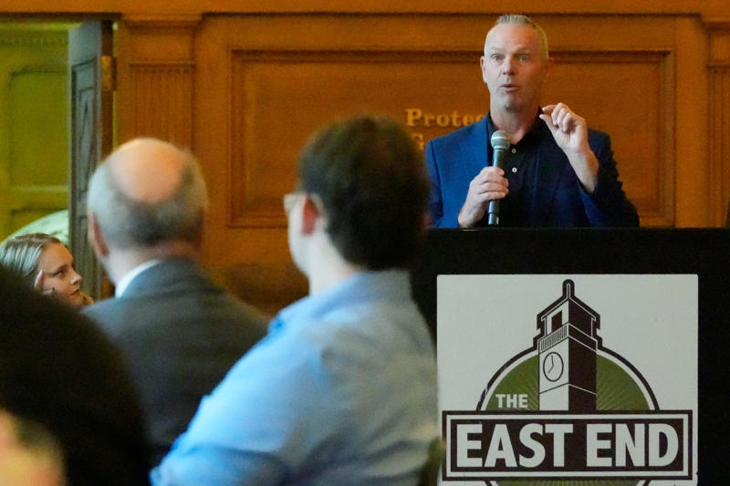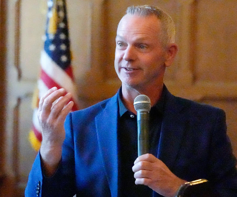 Tom Flory of Serra Auto Park discusses the impact of tariffs on auto sales Aug. 27 at an Akron Press Club event at Goodyear Hall in Akron.
