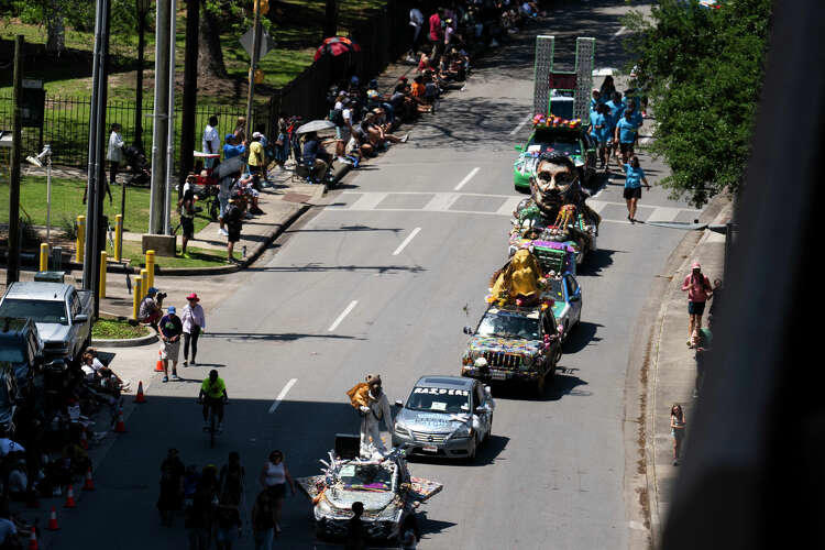 Art cars make their way down Dallas Street during the annual Art Car Parade in downtown Houston, Saturday, April 12, 2025. (Jason Fochtman/Houston Chronicle)