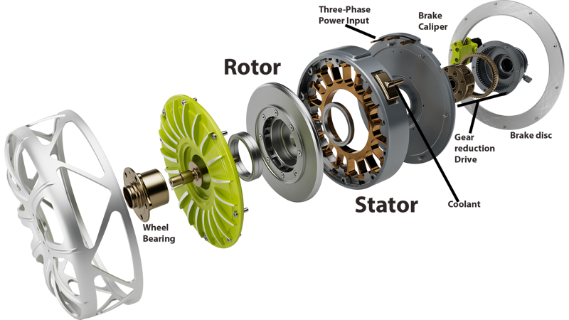OEMs looking to get an affordable PHEV to market can electrify an undriven axle with two rare-earth-free single-rotor 184-lb-ft motors capable of delivering between 922 and 1,936 lb-ft to the axle, depending on gearing. Switching to rare-earth magnets or adding a second pair of rotors doubles those numbers; doing both doubles them again. These two little wheel-hub motors therefore can simulate a single inboard motor running 8:1 gearing that makes between 115 and 968 lb-ft.