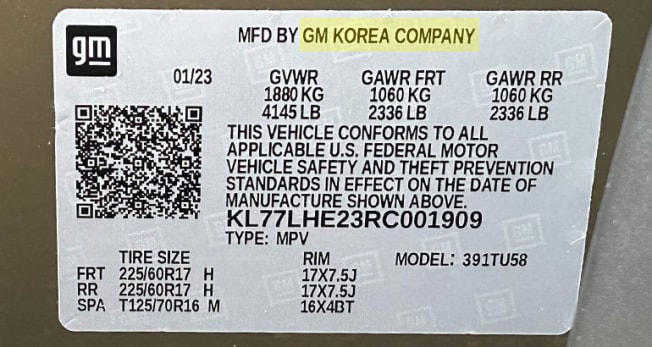 This plate, found on the doorjamb on the driver's side, shows a Chevy Trax that was built in Korea.
