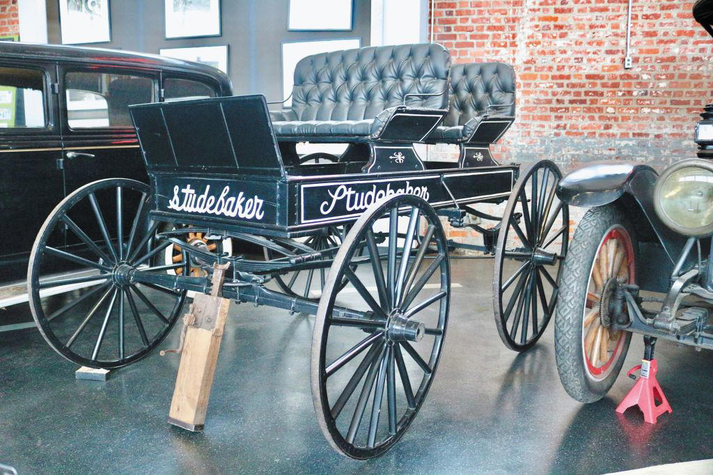 A row of Studebakers starts out with the oldest wheeled vehicle here, a circa 1870 Studebaker Half-Platform Wagon from the company’s early pioneering days as a wagon shop in South Bend, Indiana. That was before it moved into electric vehicles in 1902 and gas-powered vehicles in 1904. A 1913 Studebaker on view represents the latter foray.