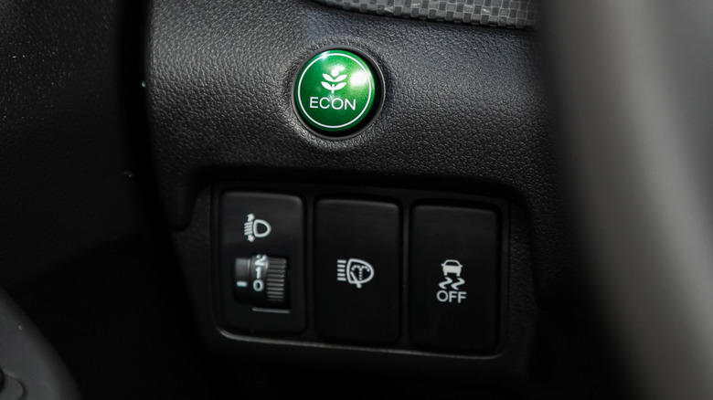 Some Honda vehicles have a green ECON button on the left of the steering wheel or in the console near the shifter. The ECON button is part of Honda's ECO Assist feature that helps drivers save gas. The other is what Honda calls a "driver feedback system" that includes an ambient meter in the instrument cluster to help drivers know when they're saving gas. Depending on the type of Honda vehicle, the meter displays blue or white when driving aggressively and turns green when efficient driving is detected.