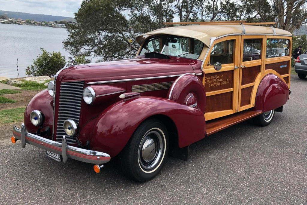 1937 Buick Special Series 40 Woodie Wagon, parked near a lake, front view