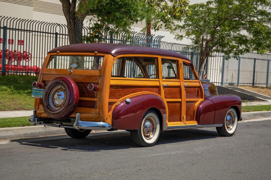 1948 Chevrolet Fleetmaster woodie station wagon, rear view, parked on the street