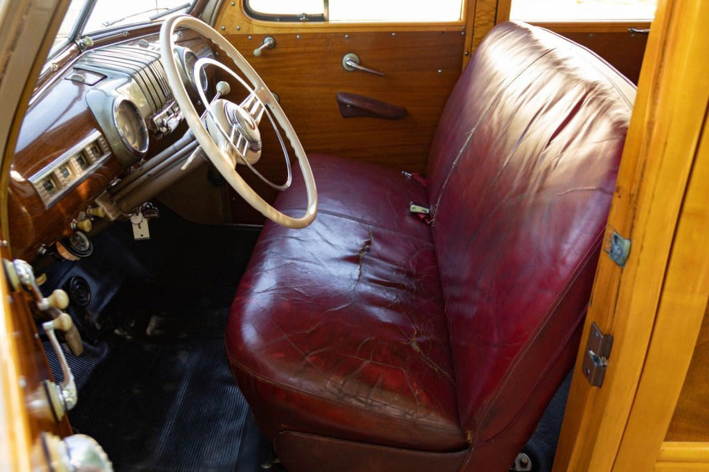 1948 Mercury Station Wagon interior showing red leather seats, steering wheel and dashboard