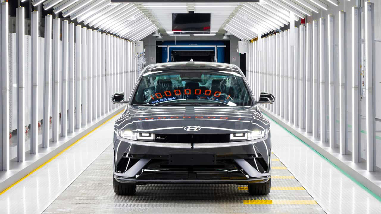 A Hyundai Ioniq 5 rolling down the assembly line at the Ulsan Complex in South Korea