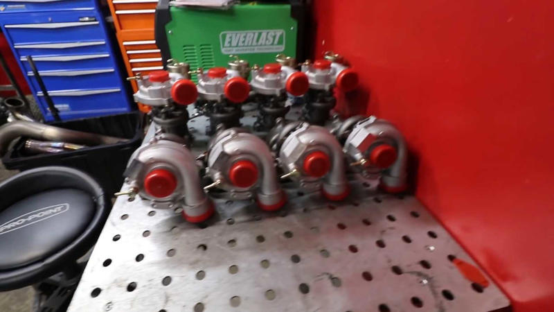 The eight-turbo Mustang began as a relatively sane LS engine swap project with the hopes of eventually getting the car up to a total power output of 1,000 hp. By the end of 2020, they had eight turbochargers ready to go, and the project was officially underway. This took lots of measurement, and lots of trial and error before they could settle on a more-or-less functional arrangement with the help of some custom framework to hold everything in place with four turbos per bank.