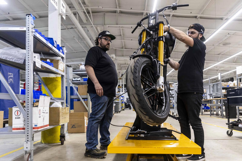 Quality technician Michael Blanchard, left, and production technician Christopher Schulte assemble a Super Cruiser test bike at Buell Motorcycle in Cascade Township on Thursday, May 29, 2025. The West Michigan manufacturer is expanding and projecting significant growth with a new motorcycle launch this fall.