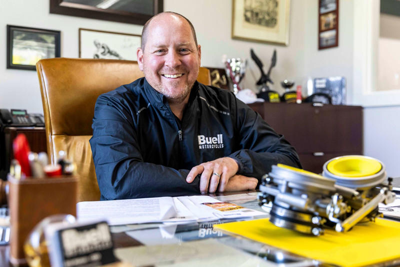 CEO Bill Melvin in his office at Buell Motorcycle Company's home base in Cascade Township on Thursday, May 29, 2025. The West Michigan manufacturer is expanding and projecting significant growth with a new motorcycle launch this fall.