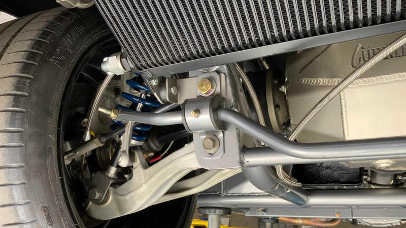 The wide body of this Corvette is supported by an SRIII Motorsports round-tube chassis, incorporating a mix of C6 and C8 Corvette components. Power steering is on board, while Corvette C8-sourced carbon ceramic disc brakes with silver calipers provide the stopping power. The restomod rides on Michelin Pilot Super Sport tires.
