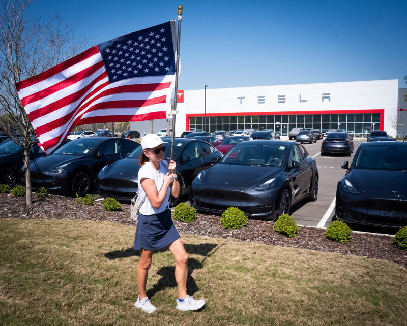 Protesters outside a Tesla dealership in Columbus, Ohio