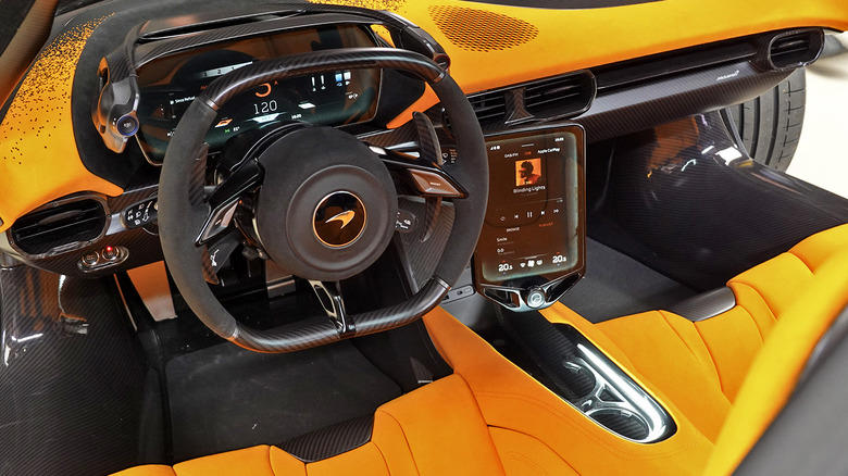 The aerodynamic requirements of besting both the Speedtail and Senna in their native habitats also dictated lifting the driver's feet up 2.5 inches higher, yet the interior looks fairly typical of mid-engined supercars. Other than the bright orange "Innoknit" fabric, a sustainable option that might look better when not decked out in the Formula 1 racing team's colors.
