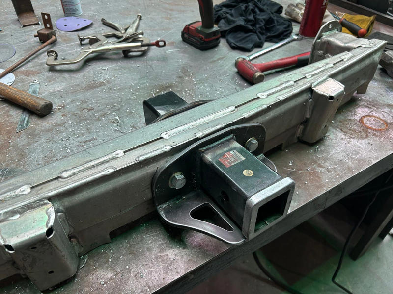 the custom towing hitch installed on alex norman's 991 generation porsche 911 with a mobile welding trailer