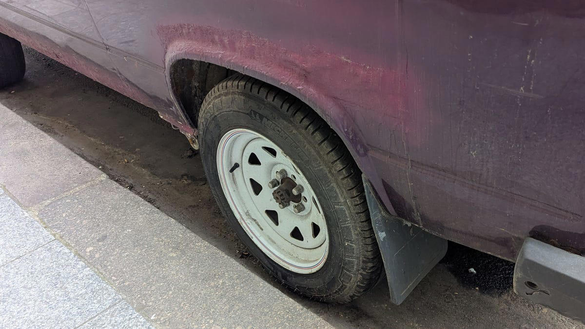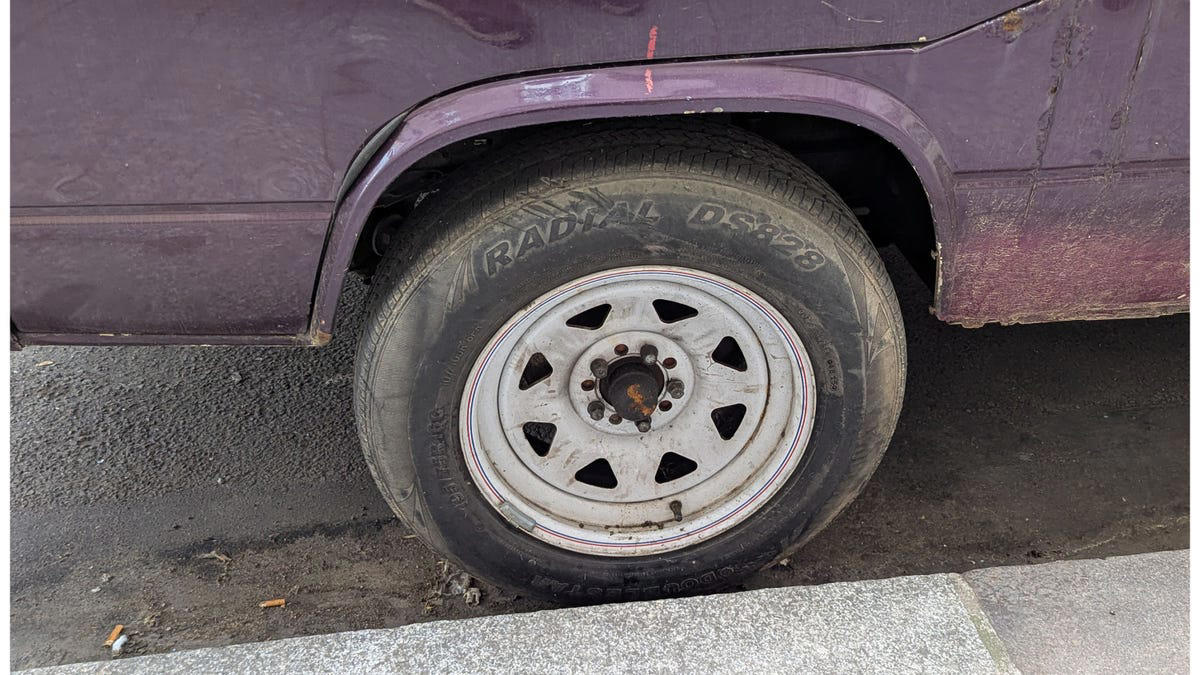 The universal-fit trailer wheels tell drivers of shiny new cars to keep their distance.