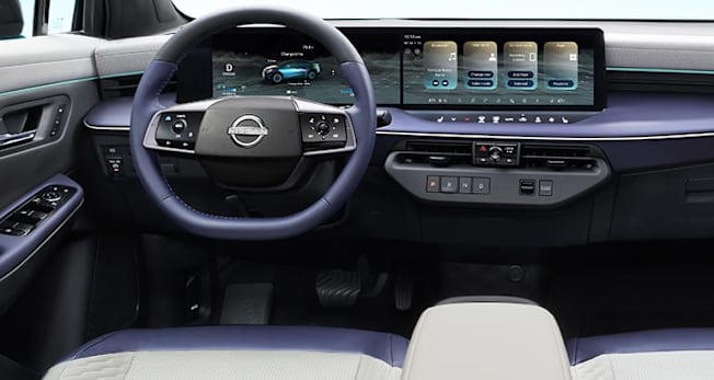 Nissan’s EV remains front-wheel drive, gets a NACS port, offers a choice of two powertrains, and finally has a telescoping steering wheel
