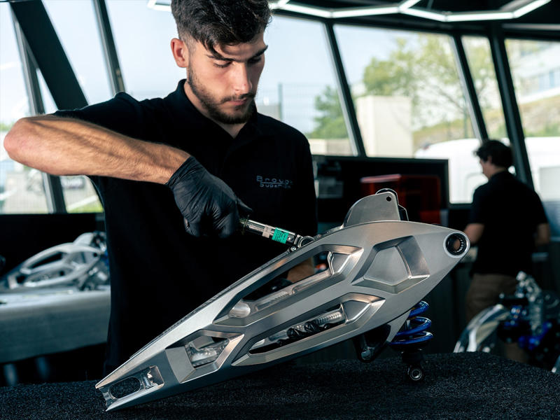 Under the hood, the RMB01 is powered by a sculptural 997cc twin-cylinder engine machined from solid blocks of high-quality aluminium. Each component is optimised through precision machining and hollowed out, leaving only 23kg of finished parts from the initial 160kg of raw material. The result is an engine that is lighter and flexible for the demands of both track and everyday life.