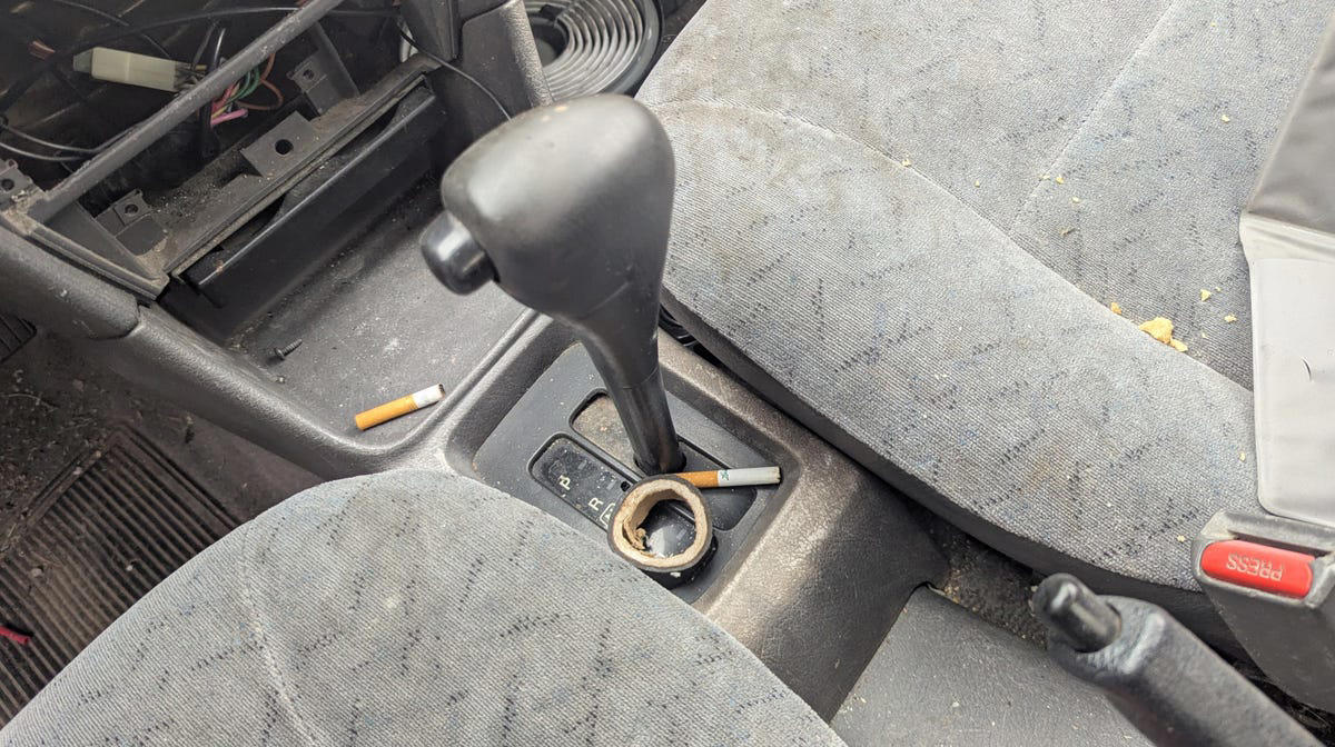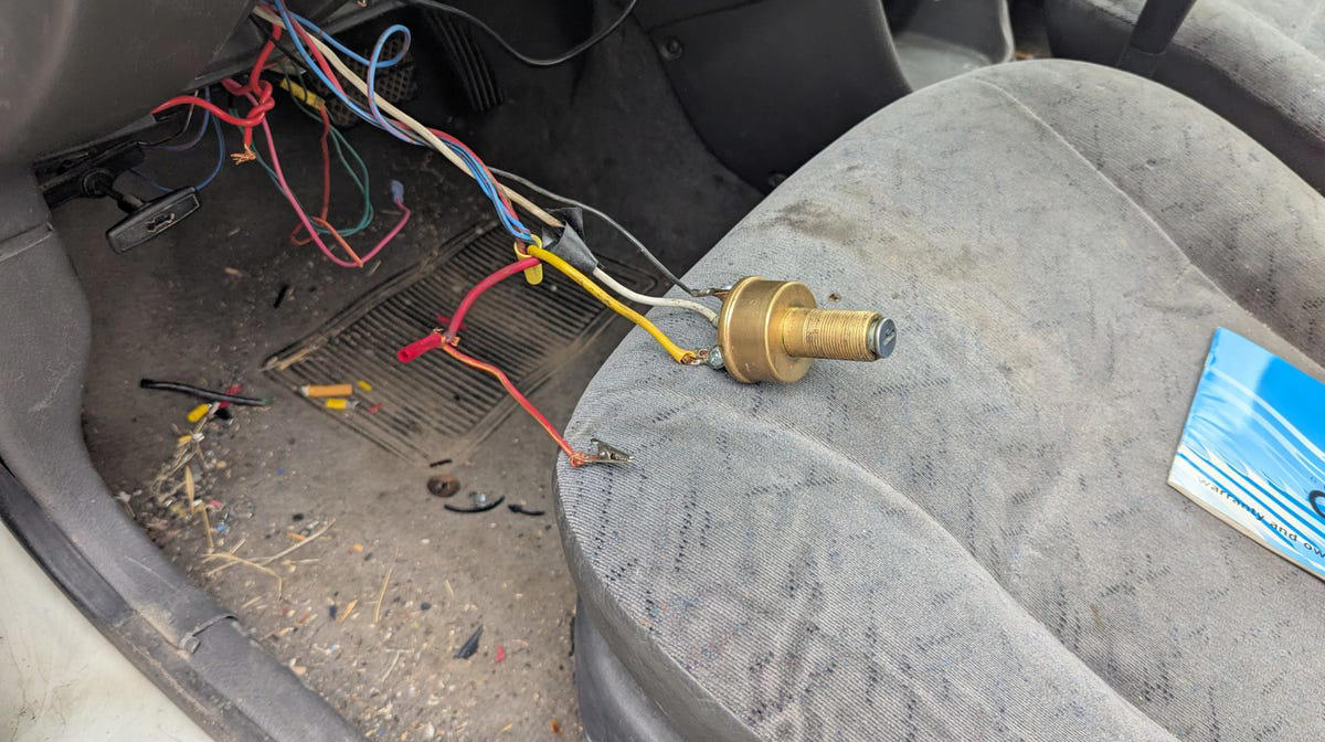 The ignition switch was punched out and crudely wired up to dangle between the driver's feet, meaning either this car was a theft victim or the recipient of a hasty field-expedient repair during its final days.