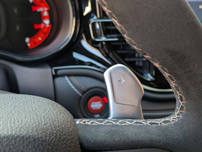 A plus is the Uconnect 5 infotainment system, the best Stellantis has on offer, though the part-analog, part-digital cluster was a tad hinky, with noticeable lag from inputs. There's a hard button for everything outside of the drive-mode control, which is frustratingly tucked into the touchscreen. And while I'm glad the typical Stellantis-product media controls can be found on the rear of the steering wheel, the shift-paddle size felt awkwardly small as a result.