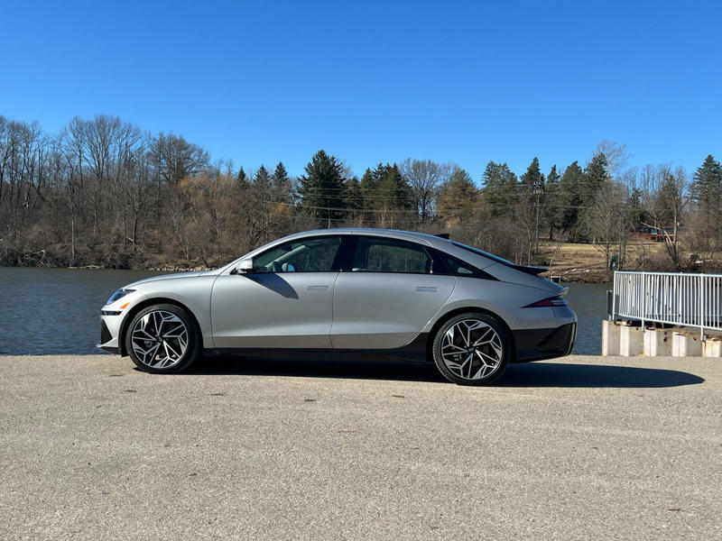 Because EVs are more common in a taller, crossover orientation, the carlike feeling of the Ioniq 6 is a novelty. That's good. It has excellent body control, although the ride bobbled on some of the washboard surfaces I drove it on, and the big wheels had the familiar tire-slap noise over expansion joints that comes with a high curb weight and low sidewall. Wind noise on the highway was a middle pitch that easily faded into the mental background.