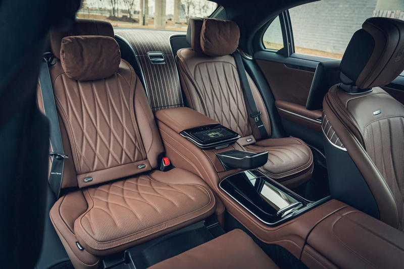 The cavernous rear compartment is elaborately tailored and in our S63 had options totaling $11,000. These included highly adjustable individual rear seats with separate video screens, climate controls, and foldout trays. The right one even has a power-folding leg rest. A private jet could do worse than these seats.