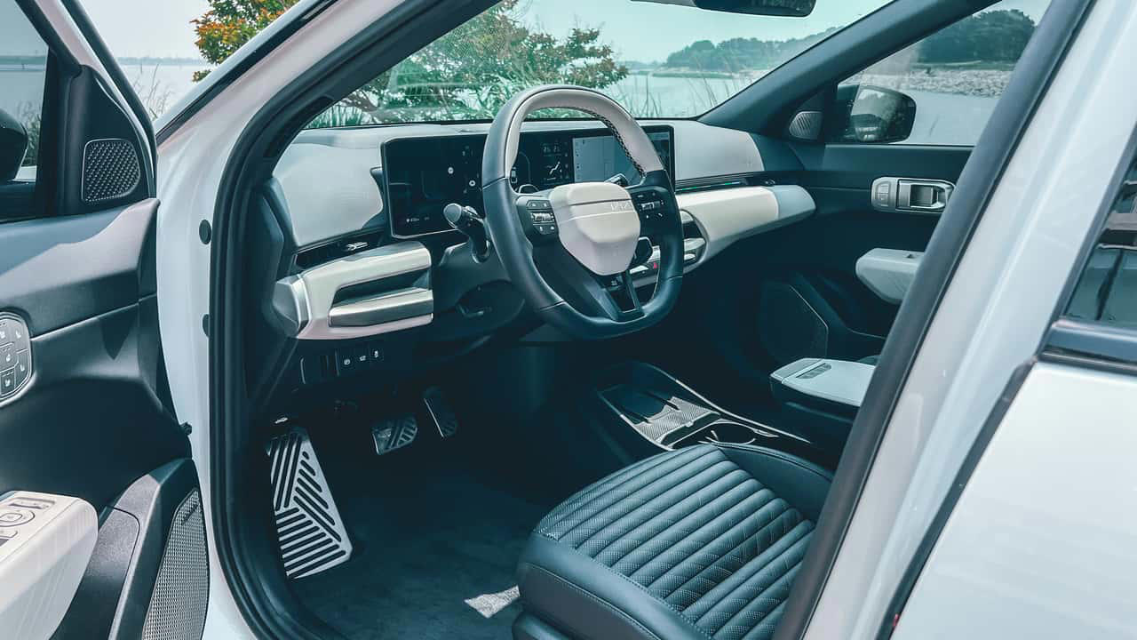 Those strange looks unlock a healthy amount of space in the cabin, both for the front and rear occupants. There’s a healthy amount of leg, arm, and shoulder room for the driver and passenger, with plenty of adjustability. The rear seats deliver ample space—far more than a Model 3—for occupants of all sizes. It reminds me of the Ioniq 6 in the way the rear bench can easily accommodate six-foot-plus people with ease—not a coincidence, seeing as how the two cars share a platform.