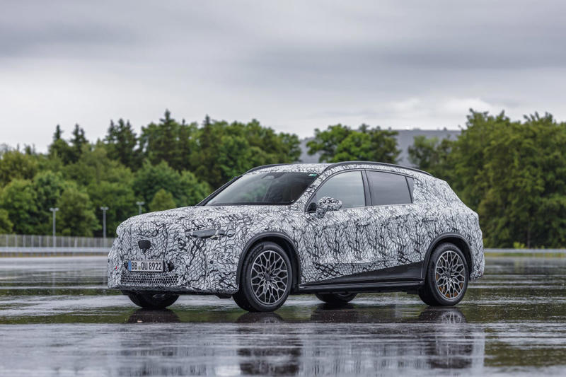 The re-created mountain road simulation on Mercedes's Immendingen proving ground revealed this GLC to be competent and dynamically familiar to other GLC models. There was enough shove from the more potent rear motor to encourage some slip angle on hairpin corner exits. But there was also a little roll and slop when pushing along quicker than normal, revealing the suspension definitely prioritizes comfort. That's probably as it should be in a non-AMG Mercedes product, leaving plenty of overhead for Mercedes to tauten things up later.